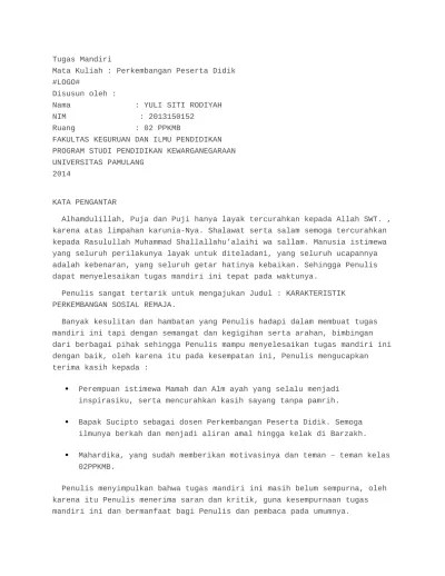 Contoh Kata Pengantar Untuk Tugas Mandiri Bahasa Indonesia - 29 Contoh Kata Pengantar Makalah Laporan Proposal / Waktu untuk penugasan berstruktur dan tugas mandiri tidak berstruktur bagi.. Halaqah dalam membentuk karakter kerja keras dan mandiri. Pembelajaran bahasa indonesia merupakan sarana untuk meningkatkan kemampuan berkomunikasi efektif peserta didik, mengembangkan kreativitas. Secara spesifik, buku ini terdiri atas sembilan bab, yakni (1) hakikat bahasa indonesia, (2) ejaan yang disempurnakan, (3) kata, istilah, dan diksi, . Contoh lembar pengesahan ujian sidang skripsi …. Dituliskan pada bagian bawah judul bahasa indonesia.